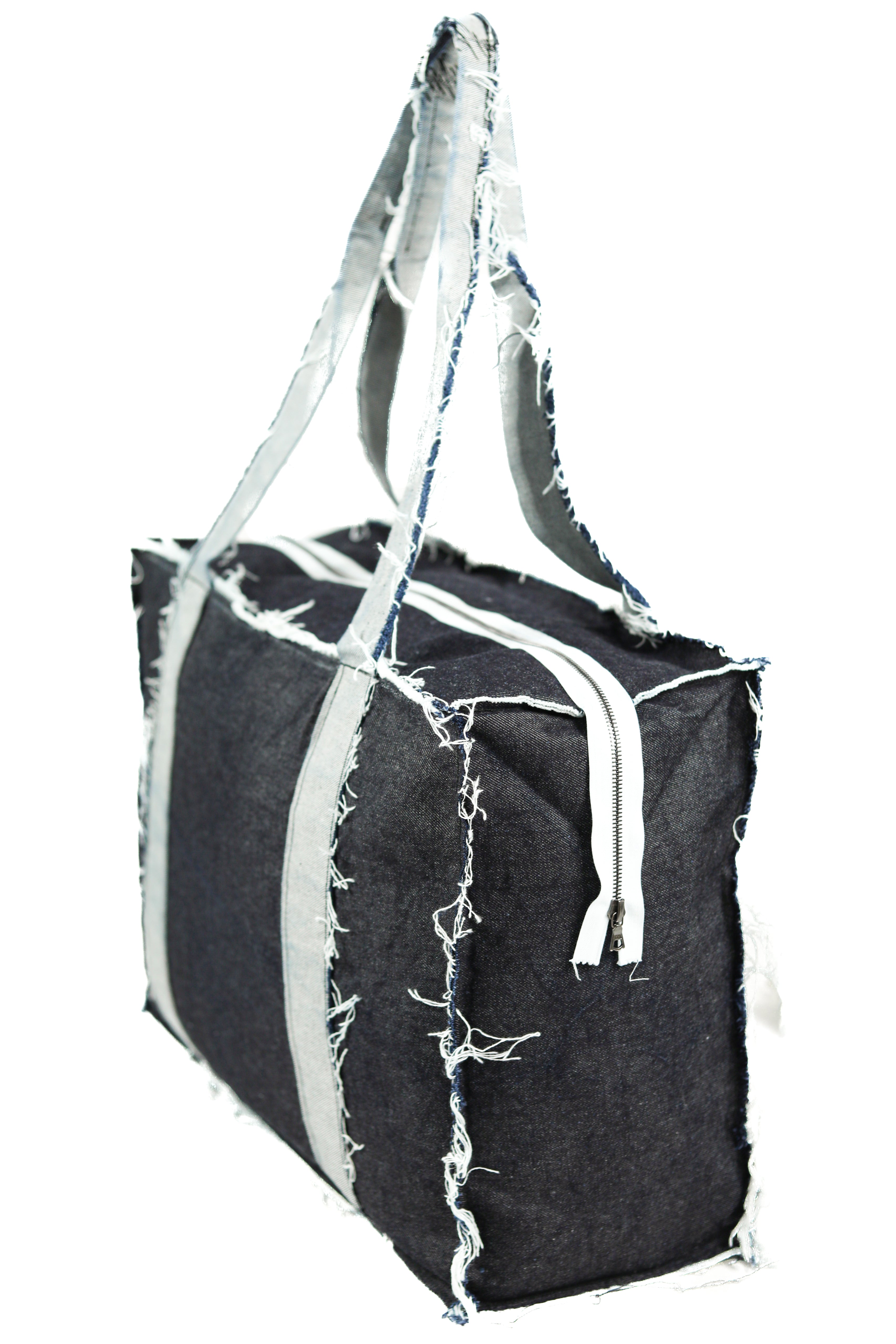 -Each tote is treated after construction to reduce bleeding and encourage natural fraying, giving every bag a unique fade and indigo bleed over time