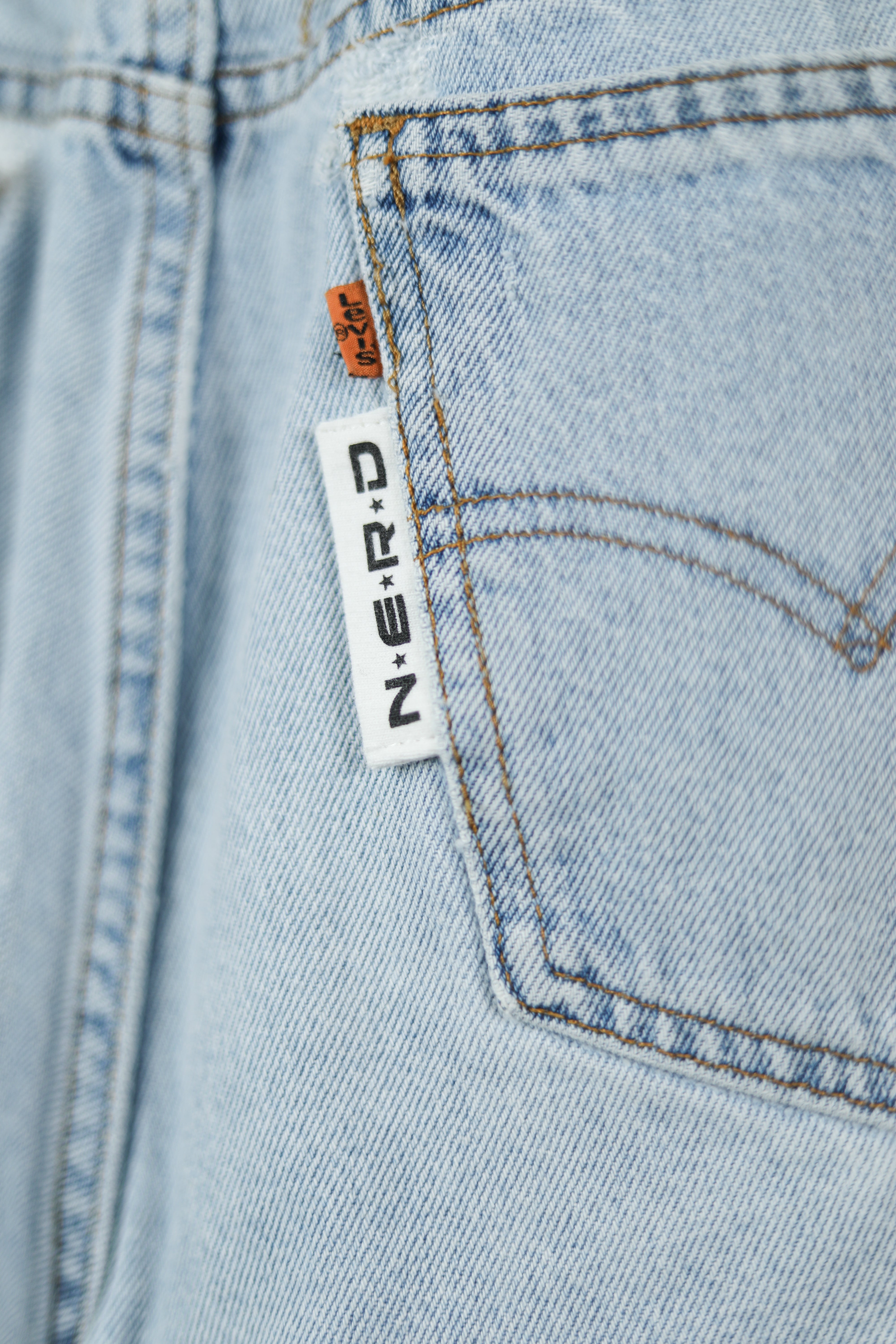 Original BAPE X N.E.R.D Fly Or Die promo tee reworked and reimagined onto orange tab Levis shorts with an added side panel